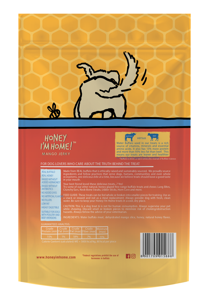 When jerky isn't enough you can turn to our Mango Jerky. Made with dehydrated mango slices that are wrapped in our delicious jerky, these treats are sure to delight even the pickiest of dogs! These treats are rich in flavor, high in protein, and low in fat. A Healthy Dog Treat: Honey I'm Home treats are made from human-grade water buffalo. You can have peace of mind knowing you are rewarding your dog with a delicious and healthy dog snack. Simple: We only use simple, easy-to-read ingredients like Buffalo and Honey. You can be confident that your dog is getting the nutrients it needs from the best dog treat possible. All of our treats are fully digestible and safe for pups with beef and poultry allergies! Buffalo Vs Beef: Buffalo meat, besides having a rich, natural flavor. Each bag is approximately 5.29 ounces Ingredients: Buffalo meat, dehydrated mango slice, honey, natural honey flavor, amylogum, potassium