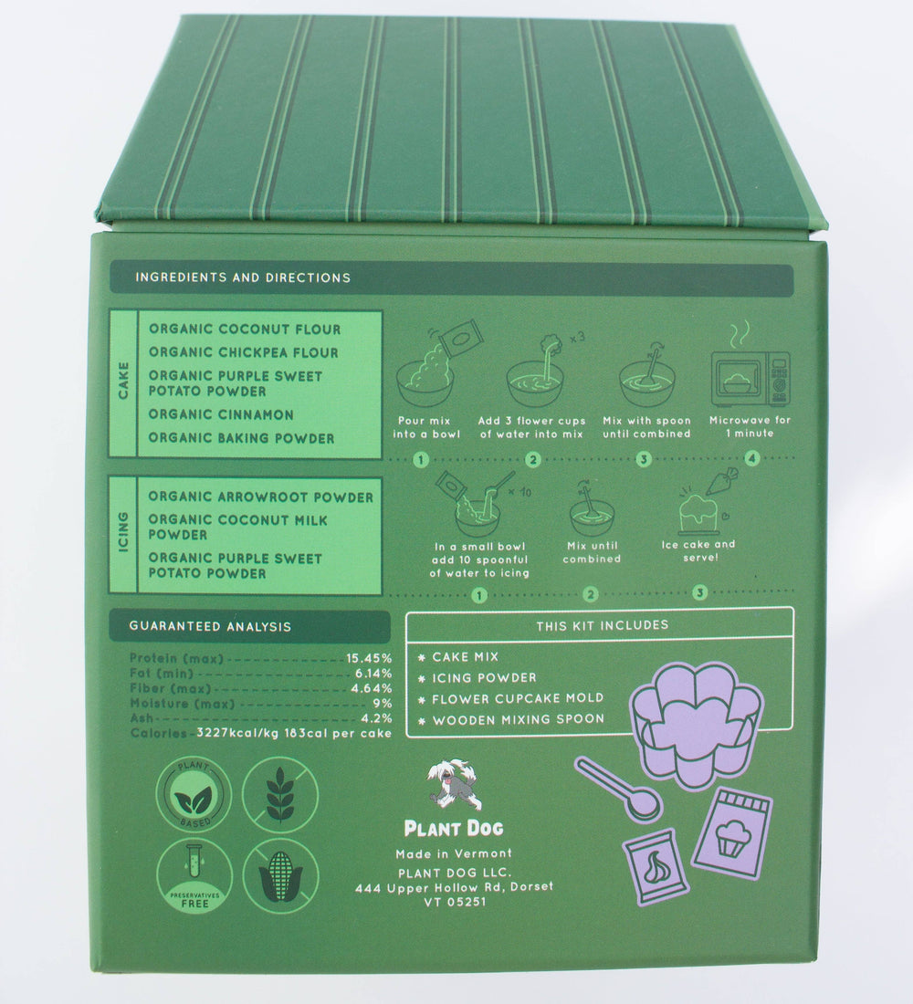 Tired of seeing icky cake mix ingredients on the market for our pups, we decided to change that by creating a unique, limited ingredient, allergy friendly, yummy and aesthetic pleasing UBE CAKE MIX! Ingredients: Cake Mix: Coconut Flour, Chickpea Flour, Ube Powder, Baking Powder, Cinnamon Icing: Arrowroot Powder, Ube Powder