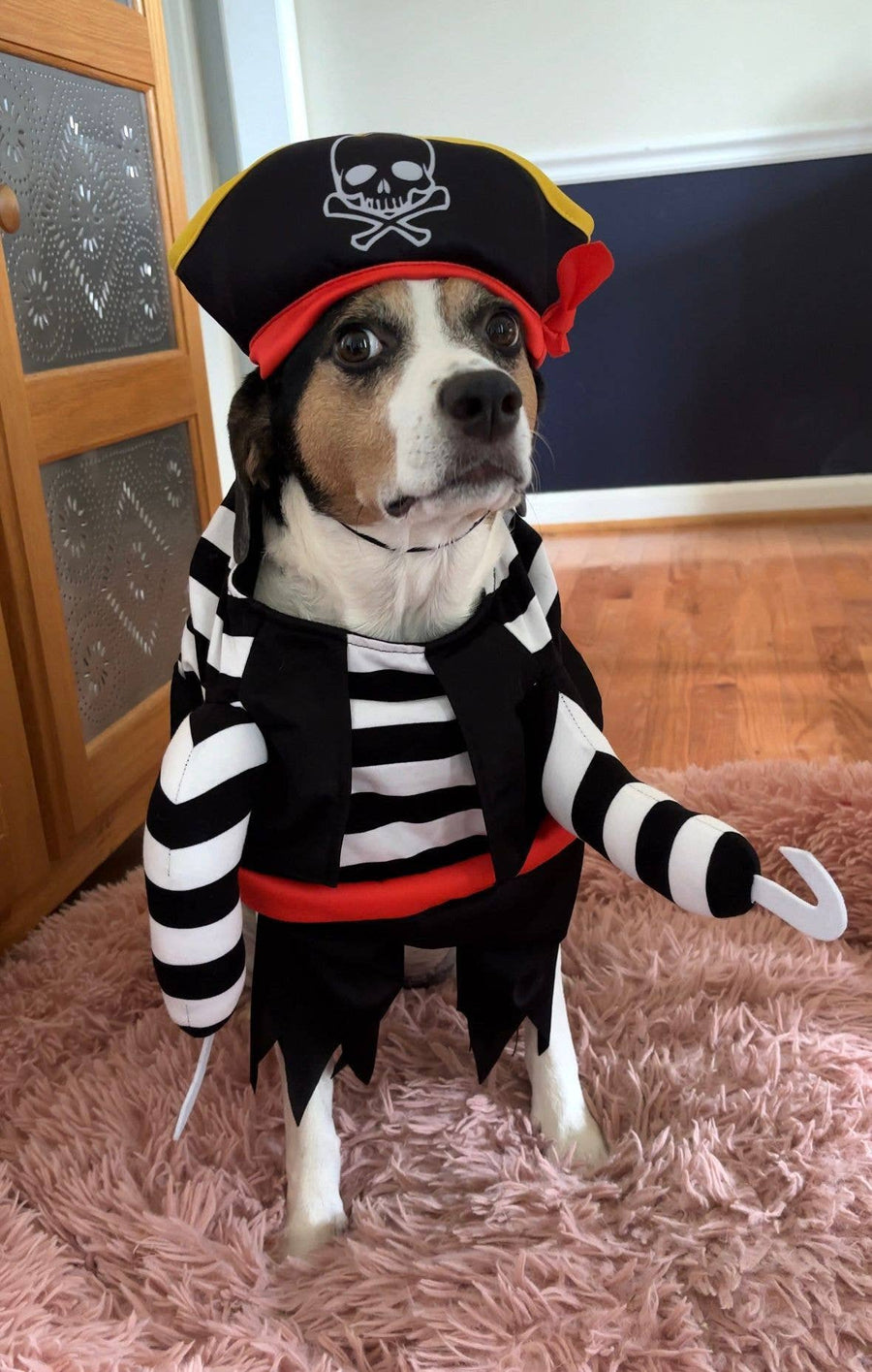 Introducing our Black Paw-irate Dog Costume - crafted from premium knitted fabric for a comfortable and durable fit. This costume features a classic skull and crossbones design, making it perfect for any aspiring buccaneer. Whether it's Halloween or just a playful day your pup will steal the show. Made to withstand the wildest treasure hunts and daily wear, this costume is built to last through all your seafaring adventures. So gear up your loyal companion for some high-seas fun and make a statement with this custom fit. It's a treasure worth barking about!