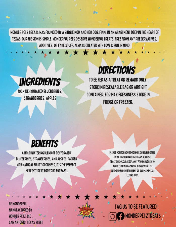 Crafted with love, this delightful mix of dehydrated organic apples, blueberries, and strawberries is the ultimate treat for your furry companion.