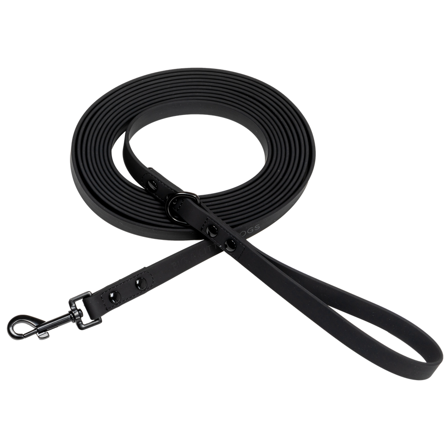 Introducing the BIG & LITTLE DOGS "BLACK" dog waterproof long leash: * Perfect accessory to give your dog freedom to explore, but allow you to remain in control * A great tool to maximise recall training * Can be wiped clean with a damp cloth to remove any dirt * Lightweight, soft to touch and made from durable waterproof coated materials * Extra stitching has been added to the rivets to increase durability and strength * Big & Little Dogs blind embossed logo near leash clip * Sturdy D-ring at the base of handle to clip your poop bag holder or attach your keys to * Size: 5m long / 2cm wide Care * After using at the beach or near water make sure to wash off with clean fresh water * Then ensure that the leash is completely dry after use * If material and hardware is not cleaned and dried, over time it may develop rust marks from salty water