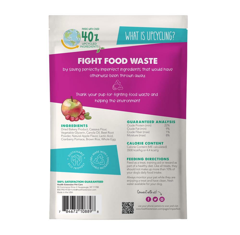 Impawfect™ treats for dogs help fight food waste by using perfectly imperfect ingredients that would have been thrown away. Made with 40% upcycled ingredients and recyclable packaging. Available in 5 recipes & perfect for Training.