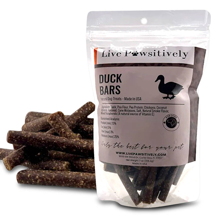 Live Pawsitively Duck Bars are all natural, limited ingredient dog treats made in the USA.  Our Bars are a great  source of protein and full of flavor your dog will love.